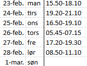 🔹 Uge 34 Mandag: 15.50–18.10 Tirsdag: 16.50–19.10 Onsdag: 15.50–18.10 Fredag: 17.20–19.30 Lørdag: 08.50–11.10
