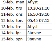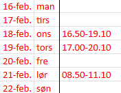 Talent træner 1½ time på følgende dage: 2/2, 4/2, 11/2, 18/2, 21/2, 23/2, 25/2, 28/2 :)